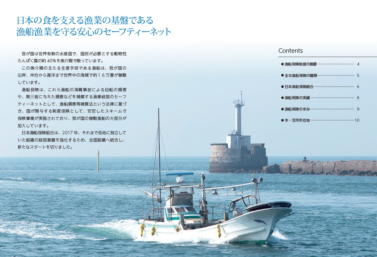 日本漁船保険組合は「漁船損害等補償法」という法律に基づいて認可設立された公的性格の団体です。漁船保険は、日本の漁船が加入する損害保険で、国の経済政策保険として、万一の事故から漁業経営を守り、漁業…