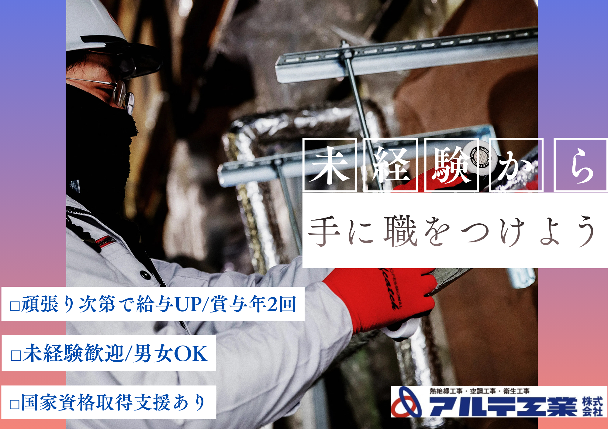 | 会社の特長 | ✅未経験な業種にチャレンジしたい方 ✅社会貢献に繋がる仕事をしたい方 ✅地盤を固めたい方 ✅AIに奪われる未来がない職を望んでいる方 このような方たちを大募集しております。 技術者としてじっくりと長く仕事に取り組みたい方に向いています。 重量物があまりない工事現場作業なので男女関係なく働ける職場となっております。 現、女性社員活躍中! |